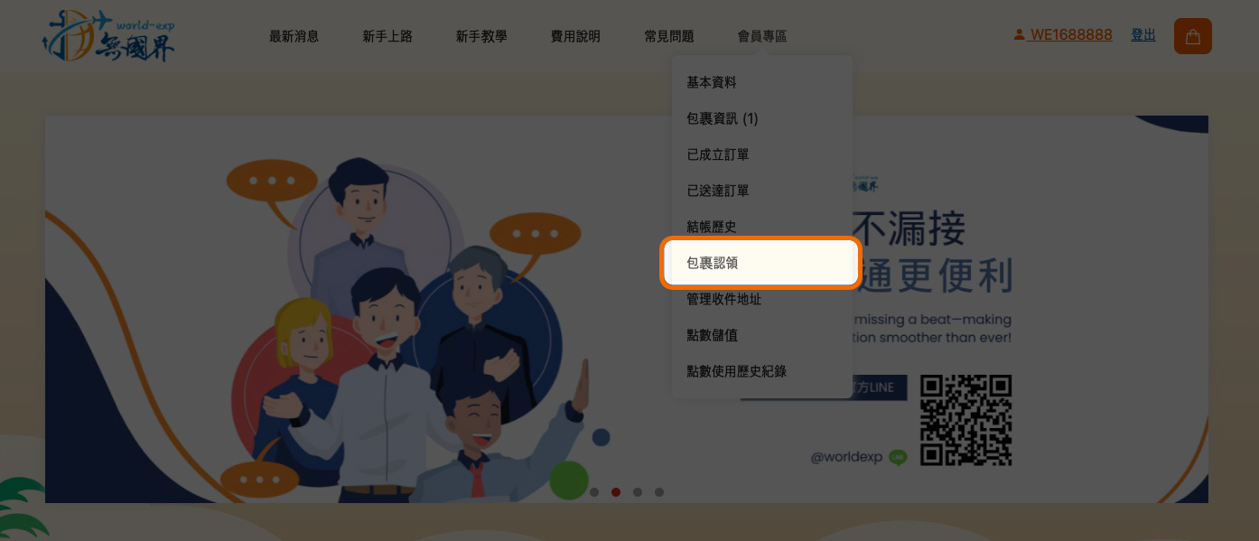 STEP 1. 登入無國界官網後點擊 「會員專區」 > 「包裹認領」。