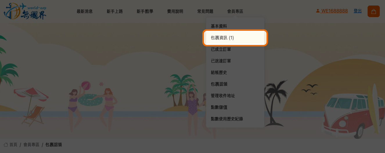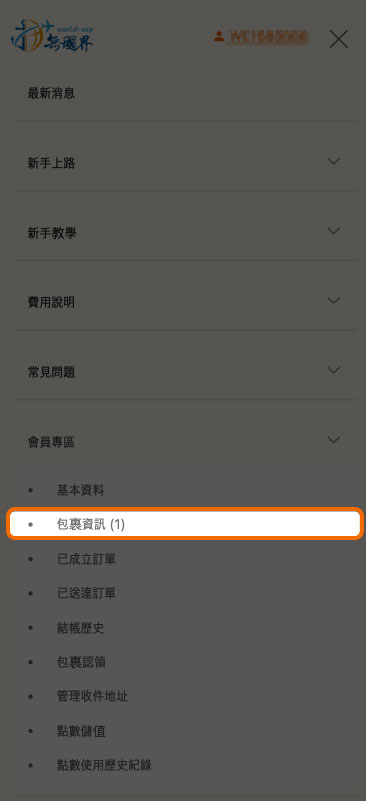 STEP 4. 進入 「會員專區」 > > 「包裹資訊」。